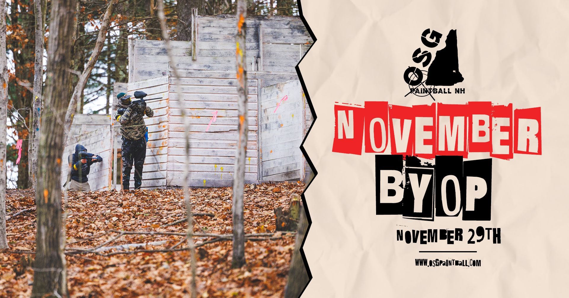 November 29th - Join us on the last Sunday of every month for our(B)ring (Y)our(O)wn (P)aint days. Larger, longer, objective based games. Expect limited wait times between games and all the paintball you can handle.