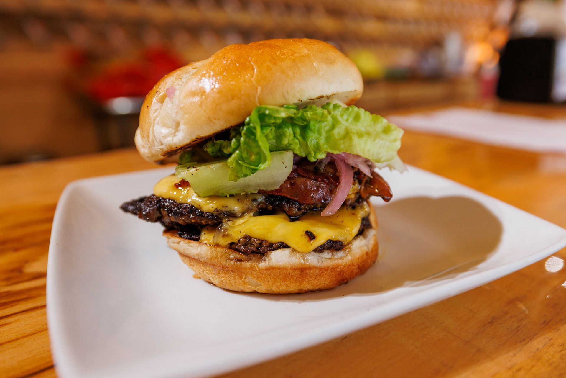 It’s pretty basic! Two 4 oz beef patties with lettuce, tomato, and pickled onion on a toasted bun.