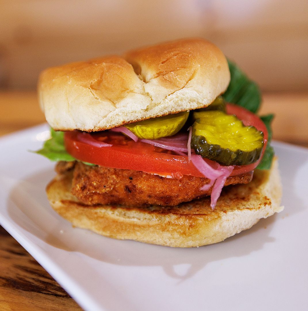 Fried spicy chicken breast, lettuce, tomato, onion, and pickles on a toasted bun.
