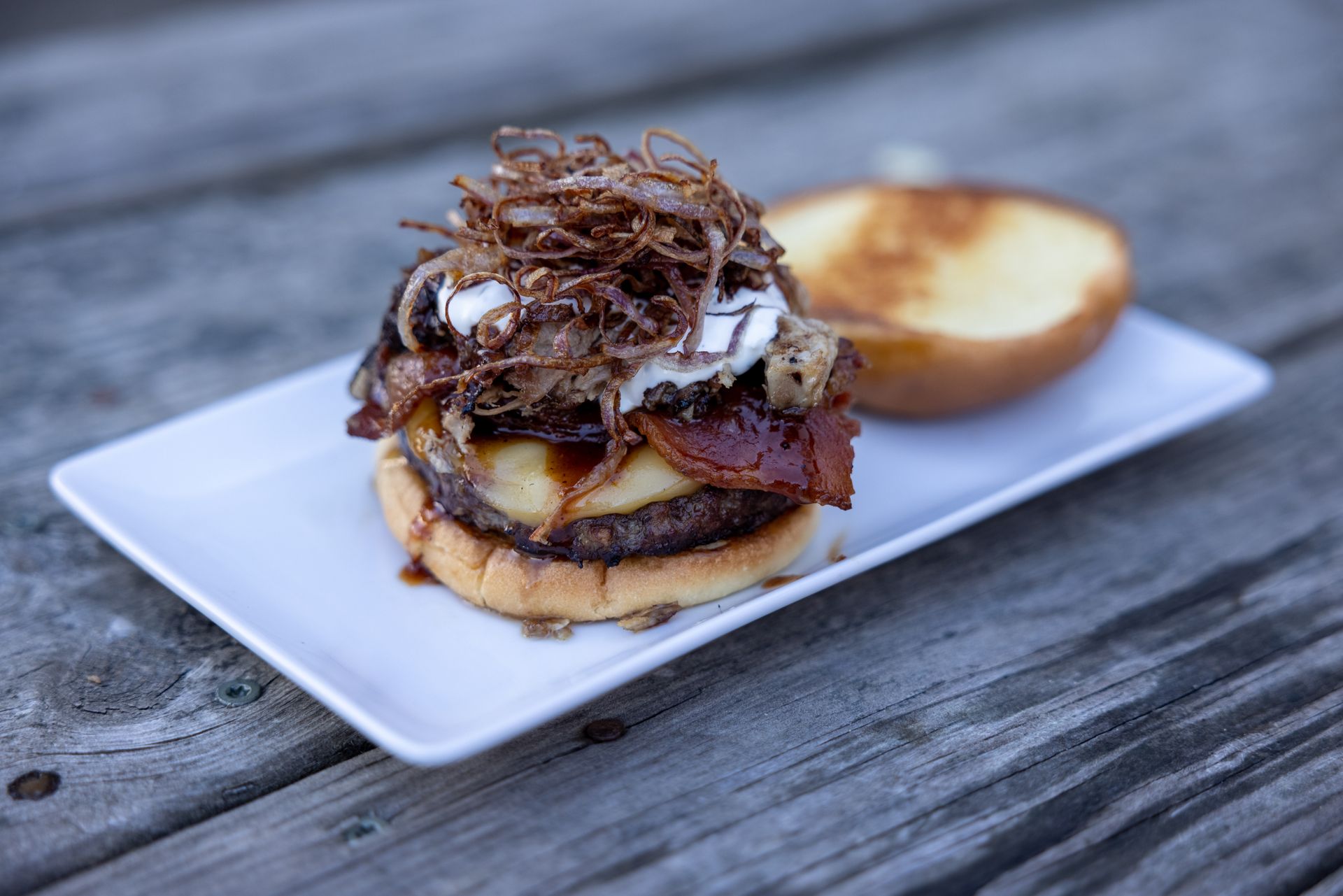 This burger is a beast! Two 4 oz beef patties, smoked pulled pork, applewood smoked bacon, melted gouda cheese, house made ranch, and BBQ sauce on a toasted bun.